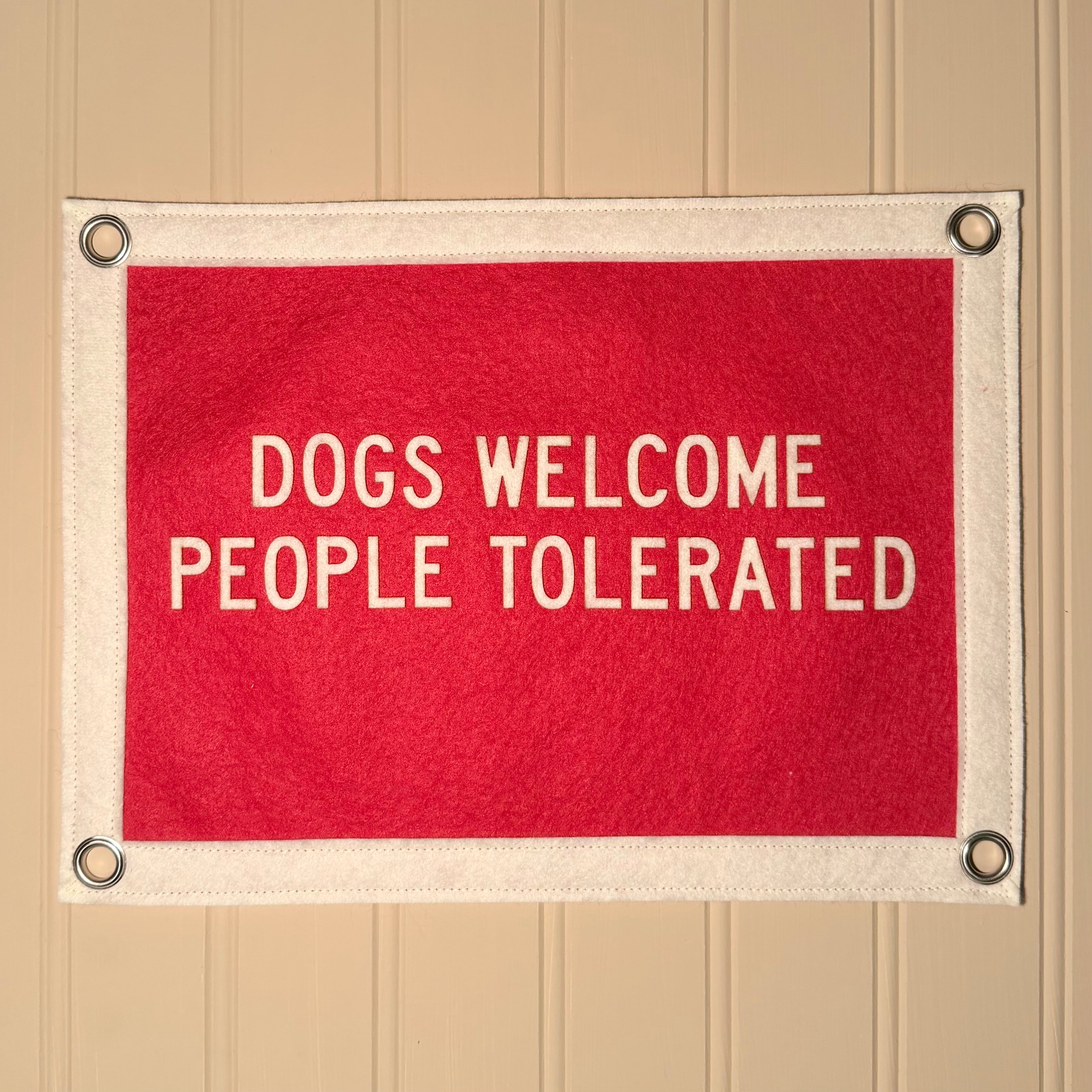 This 8.5" x 11" pennant flag features the phrase DOGS WELCOME PEOPLE TOLERATED in cream on a red background with silver color metal grommets.