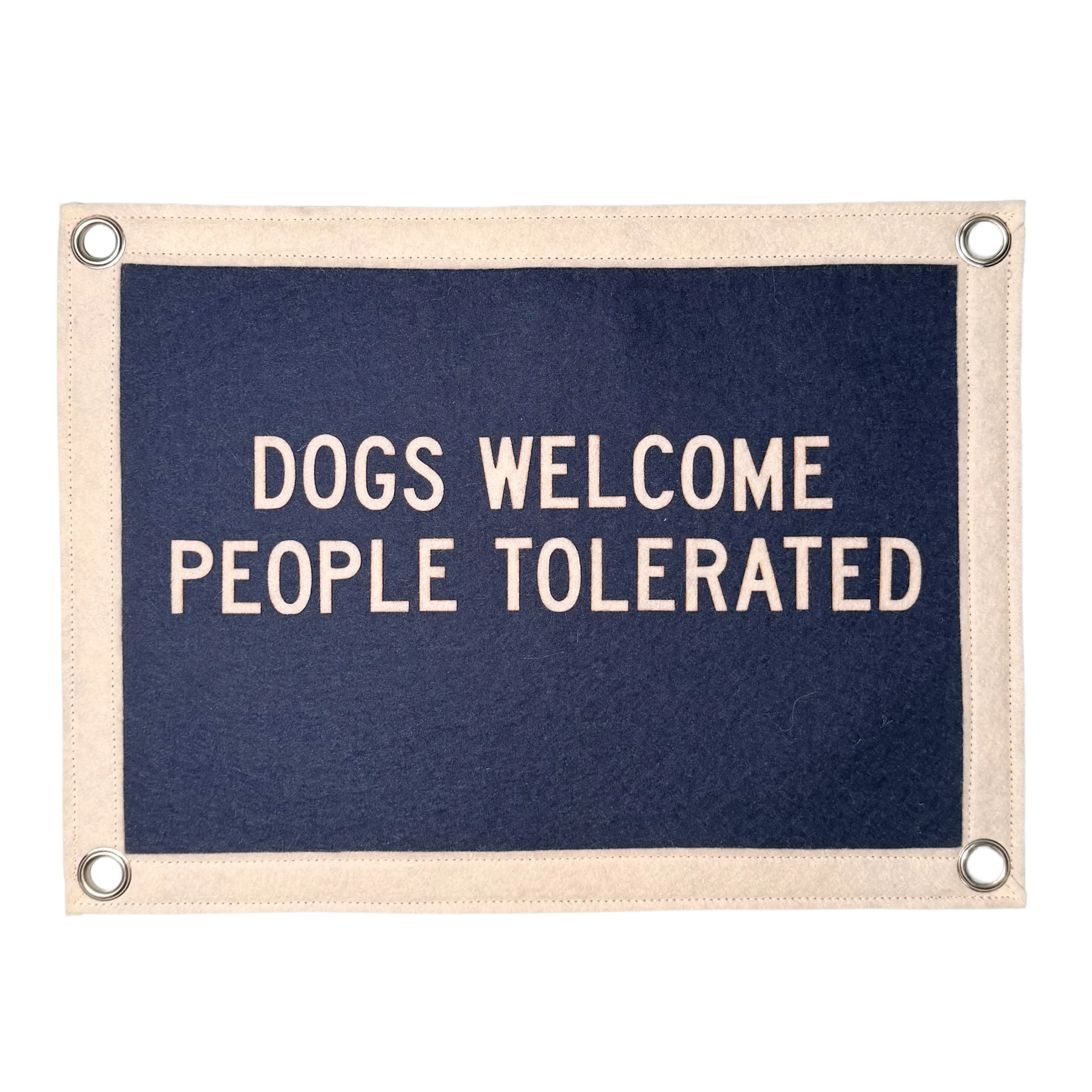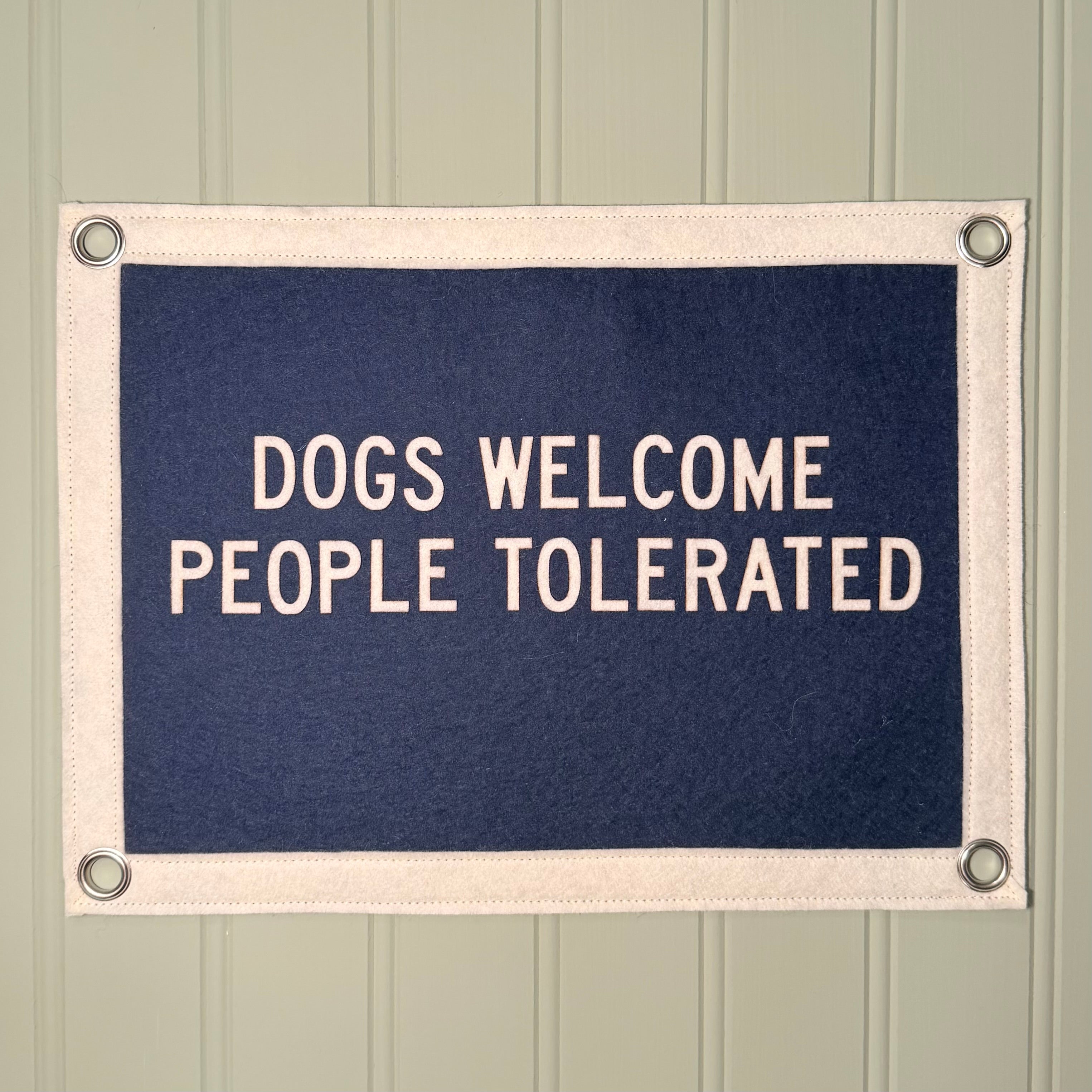 This 8.5" x 11" pennant flag features the phrase DOGS WELCOME PEOPLE TOLERATED in cream on a navy blue background with silver color metal grommets.