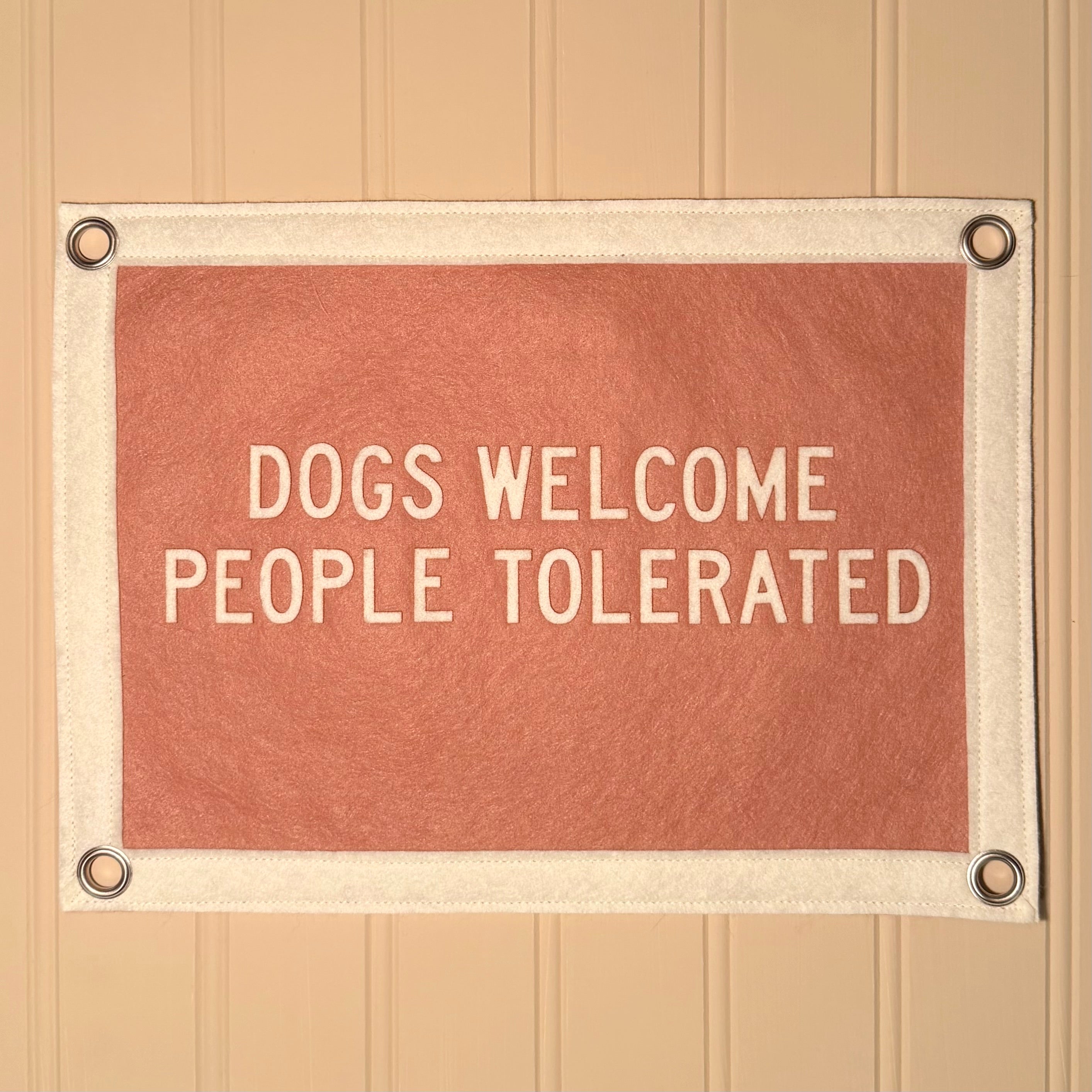 This 8.5" x 11" pennant flag features the phrase DOGS WELCOME PEOPLE TOLERATED in cream on a light brown background with silver color metal grommets.
