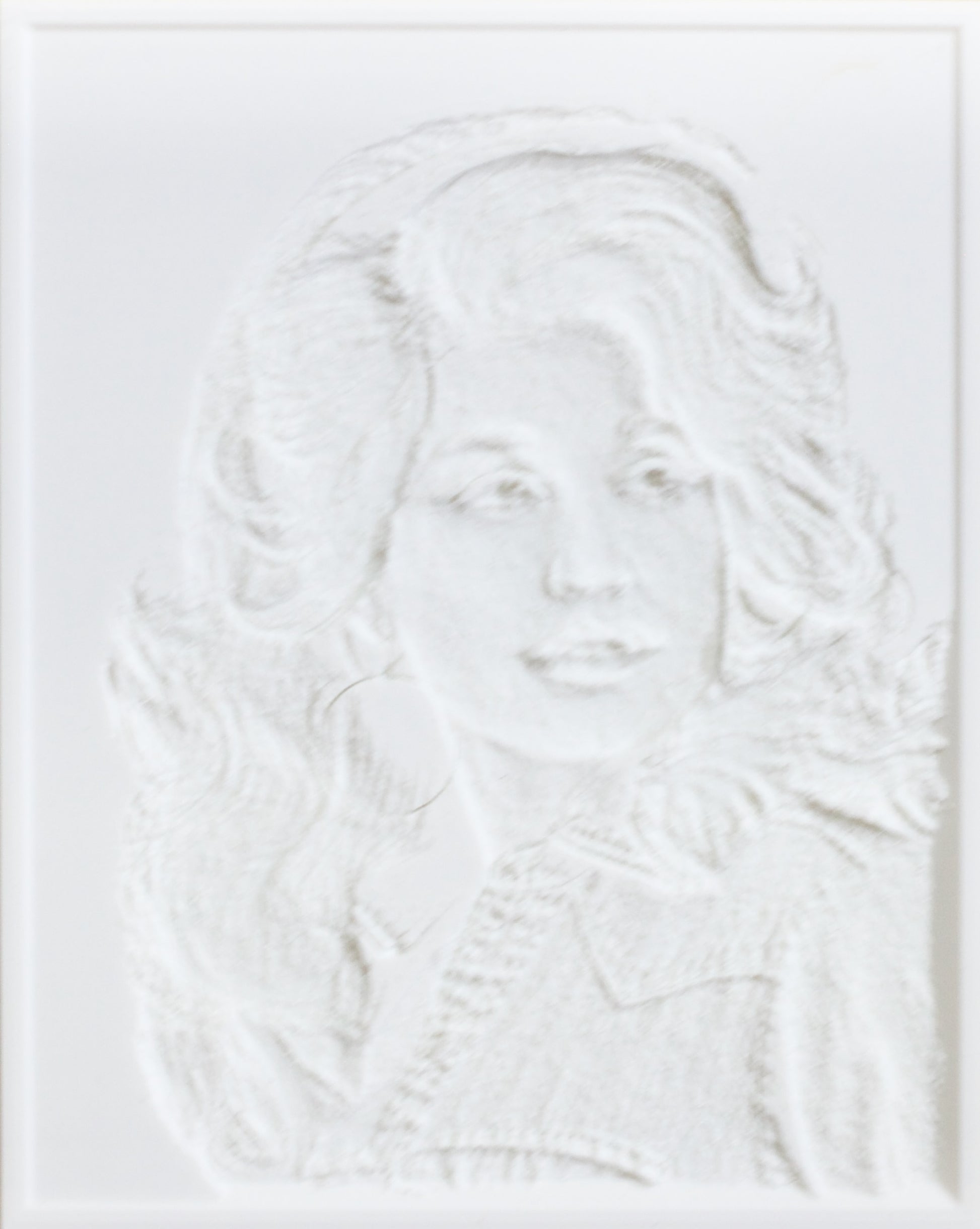 Invented in France in the 1820s, this thin 3D printed plaque of translucent material forms an image of Dolly Parton when lit from behind. Designed to rest on a window sill or against glass with included suction cup window hang.