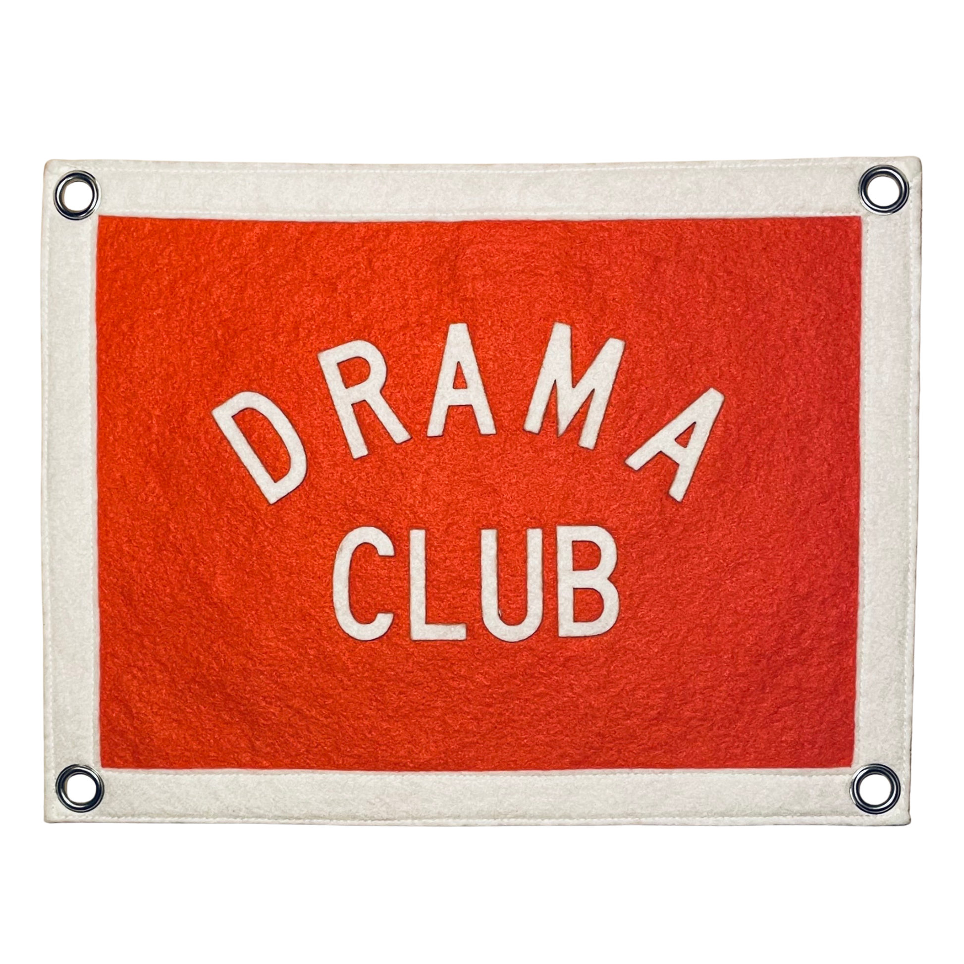 This 8.5" x 11" pennant flag features the phrase DRAMA CLUB in cream on an orange background with silver metal grommets.