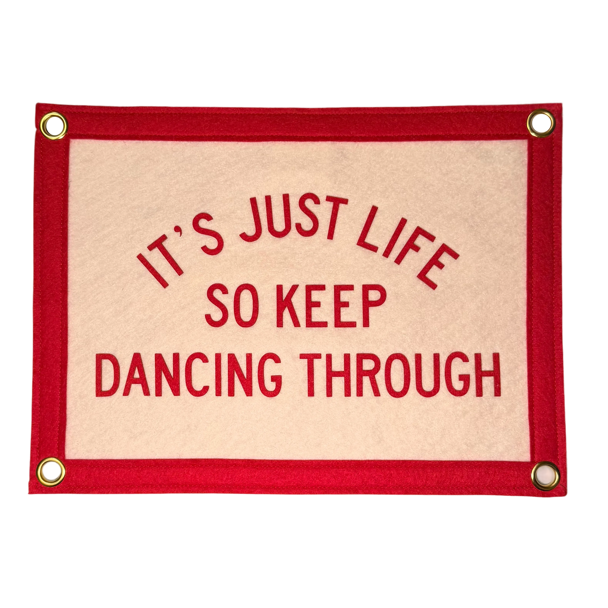 This 8.5" x 11" pennant flag features the phrase IT'S JUST LIFE SO KEEP DANCING THROUGH in your choice of colors with gold metal grommets.