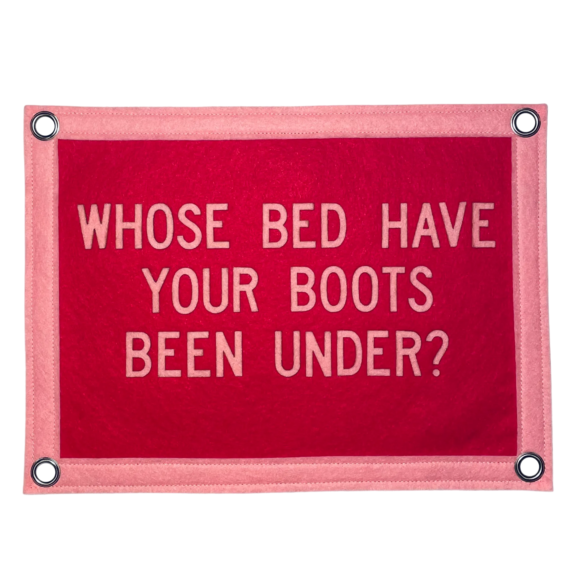 This 8.5" x 11" pennant flag features the phrase WHOSE BED HAVE YOUR BOOTS BEEN UNDER in pink on a red background with silver metal grommets.