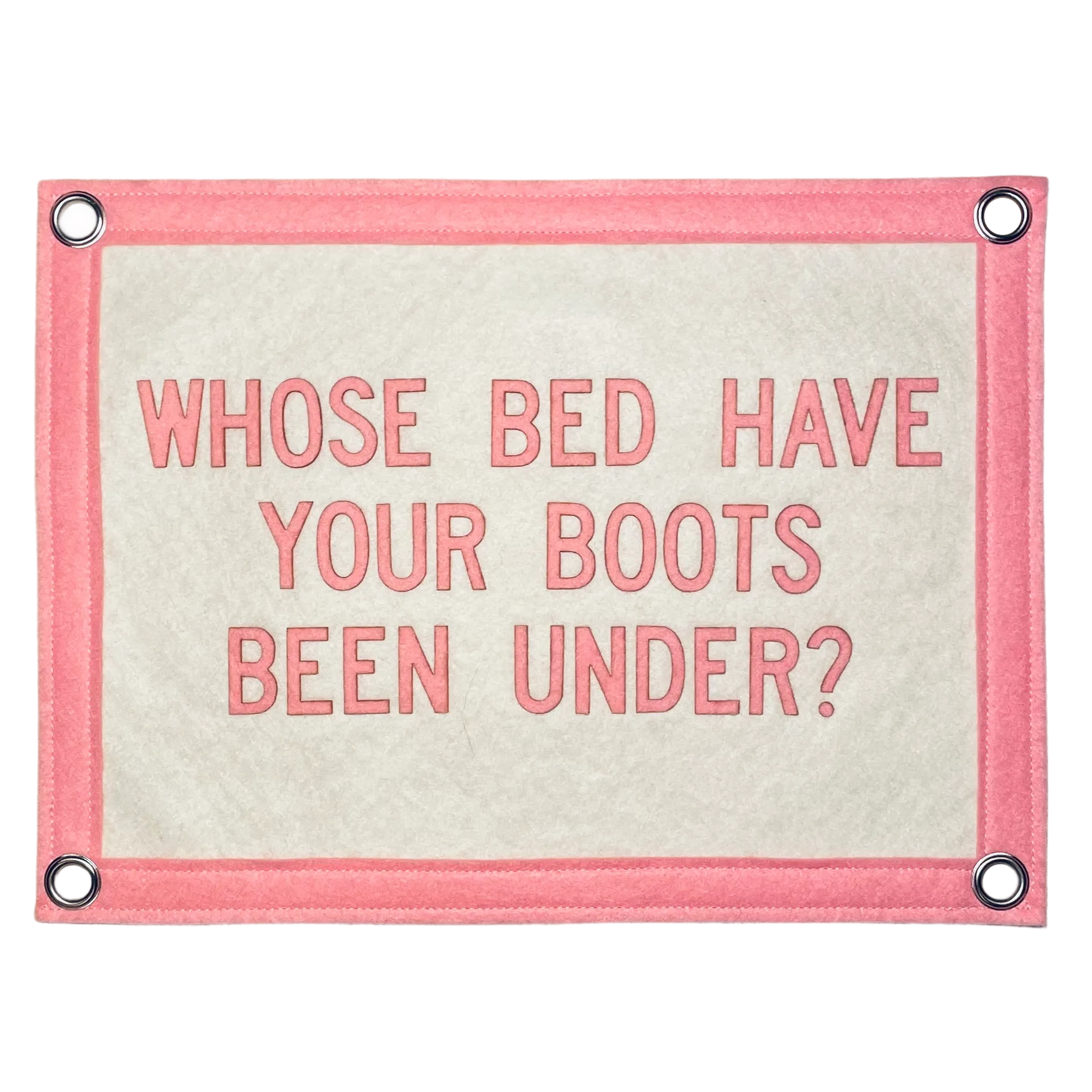 This 8.5" x 11" pennant flag features the phrase WHOSE BED HAVE YOUR BOOTS BEEN UNDER in pink on a cream background with silver metal grommets.